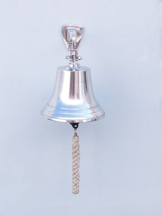 Elegantly designed and gleaming with a lustrous shine, this fabulous Chrome Hanging Ship's Bell 9" is equally stunning indoors or out, and is fully functional for actual use aboard any ship. Enjoy its wonderfully decorative style and distinct, warm nautical tone with each and every resounding ring. Each bell's length is measured from the highest point of its hanger to the lower lip of the bell, while the width is the diameter of the flared bell opening.